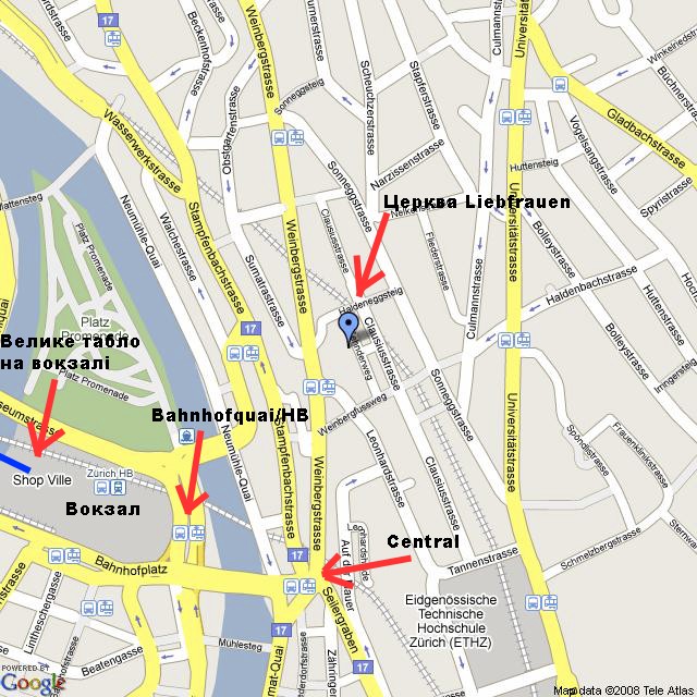 Від зупинки Bahnhofquai/HB (це та, що коло мосту, коло Coop) тролейбусом № 46 у напрямку Rütihof до зупинки Stampfenbachplatz і далі пішки 6 хвилин (дивіться по карті)